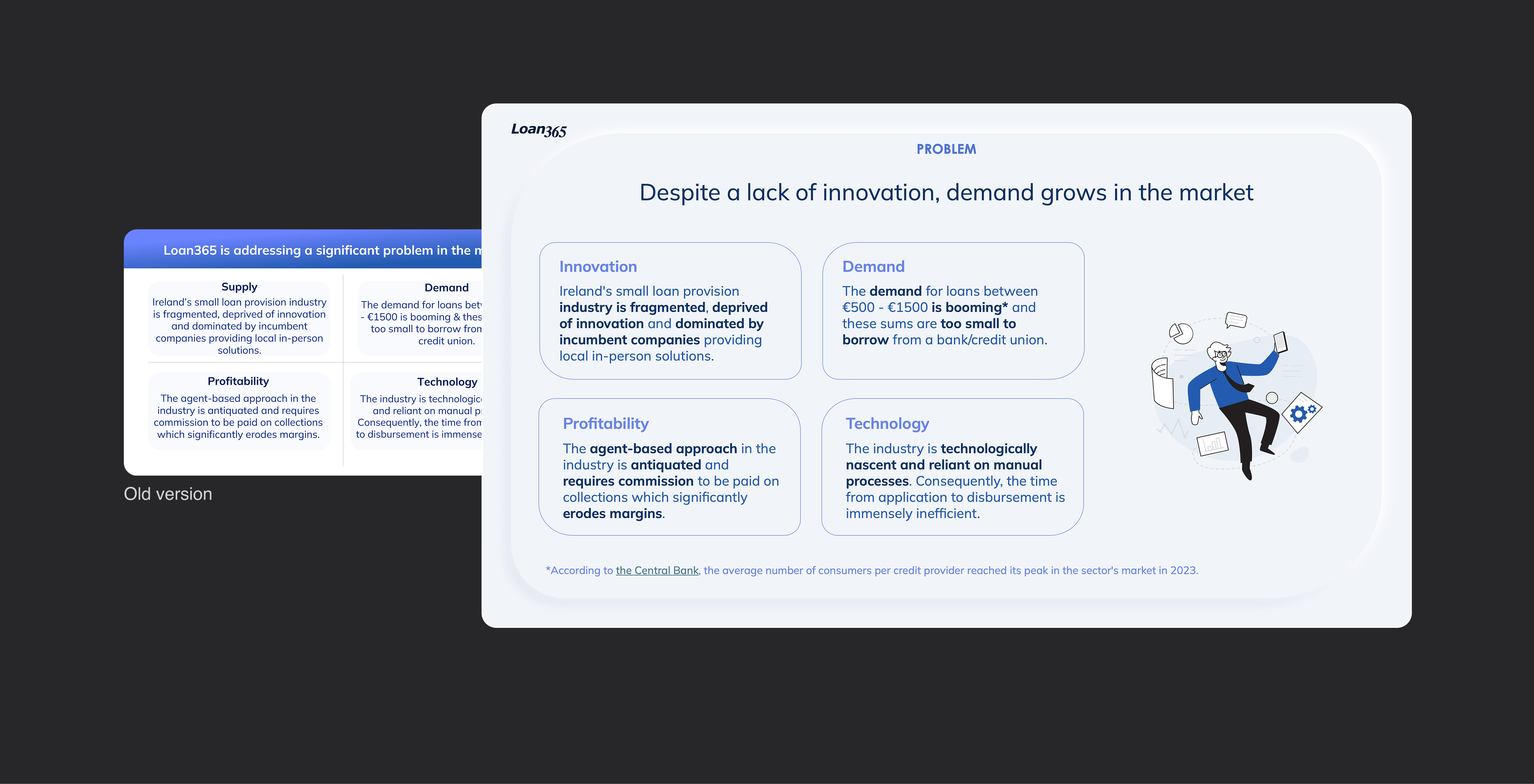 Loan 365 is a fintech company focused on providing quick money lending services. While their platform's UX/UI was well-designed, their partnership deck lacked alignment and professional quality, especially in terms of structure and content.